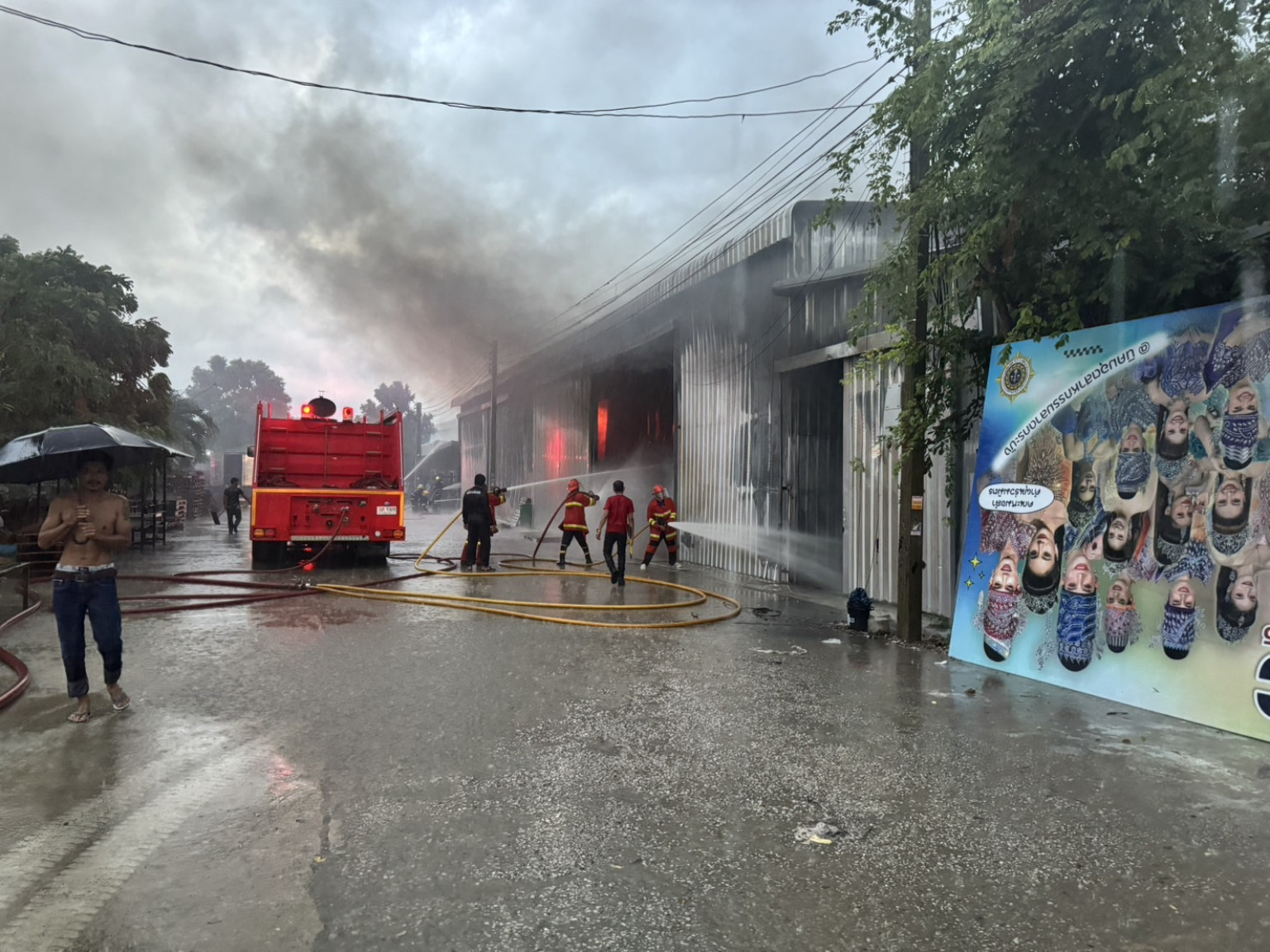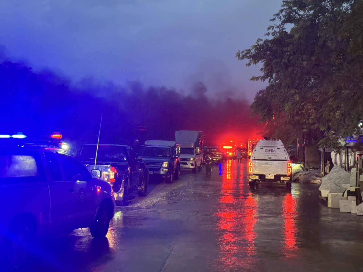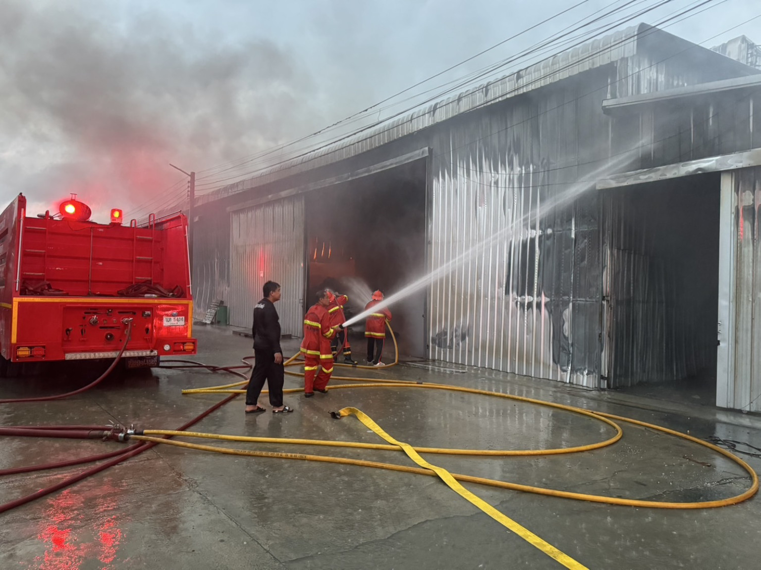ปทุมธานีไฟไหม้โรงงานผลิตกล่องกระดาษวอดกลางสายฝน