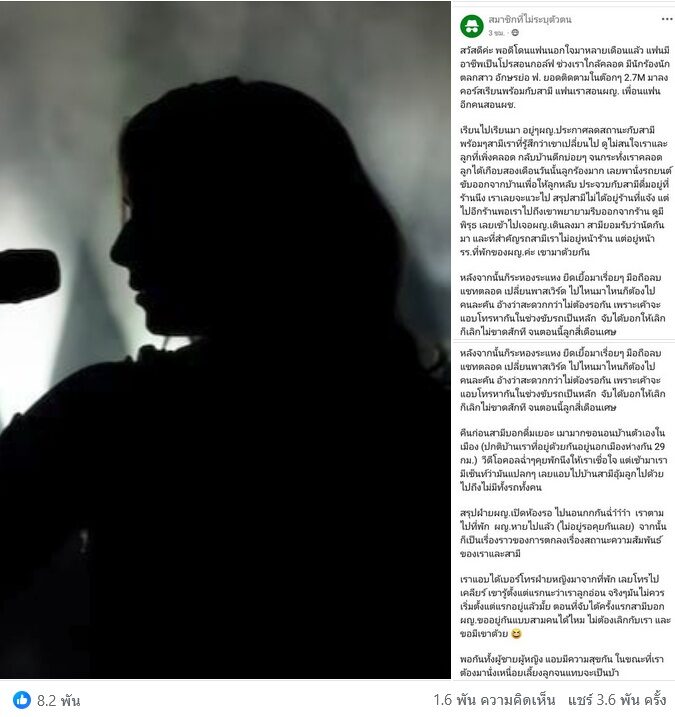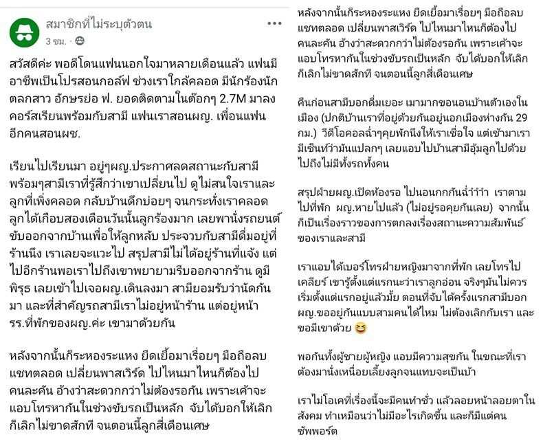 “จุดเริ่มต้นเกิดขึ้นช่วงที่คุณ A ใกล้คลอด ฝ่ายหญิงมาลงเรียนกอล์ฟกับสามีตนเอง โดยสามีของคุณ A เป็นคนสอนนักร้องหญิงคนนั้น ต่อมาสาวนักร้อง TikTok ประกาศลดสถานะกับสามีของเธอ ในขณะที่สามีของคุณ A ก็เริ่มเปลี่ยนไปอย่างเห็นได้ชัด ”