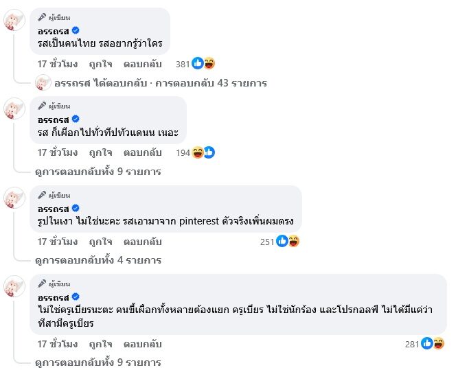 เพจ อรรถรส ยังคอมเมนต์ใต้โพสต์เพิ่มเติมอีกว่า “ไม่ใช่ครูเบียร์นะคะ คนขี้เผือกทั้งหลายต้องแยก ครูเบียร์ไม่ใช่นักร้อง และโปรกอลฟ์ ไม่ได้มีแค่ว่าทีสามีครูเบียร์”
