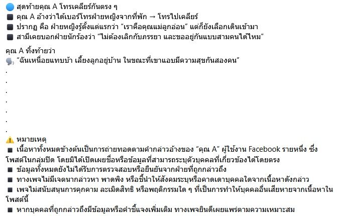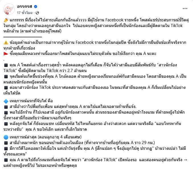 “ข้อมูลด้านล่างเป็นการเล่าจากผู้ใช้งาน Facebook รายหนึ่งในกลุ่มปิด ซึ่งยังไม่มีการยืนยันข้อเท็จจริงจากทุกฝ่ายที่เกี่ยวข้อง ซึ่งคุณเมียหลวงท่านนี้ออกมาโพสต์ในกลุ่มแบบไม่ระบุตัวต้น ขอใช้เรียกว่า คุณ A นะคะ คุณ A โพสต์เล่าเรื่องราวสุดช้ำ หลังคลอดลูกไม่กี่เดือน ก็จับได้ว่าสามีแอบมีสัมพันธ์กับ “สาวนักร้อง TikTok” ซึ่งมีผู้ติดตามใน TikTok กว่า 2.7 ล้านคน”