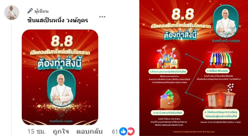 อ่านข่าวต้นฉบับได้ที่ : แนะทำ 4 ข้อ 8.8 เปิดดวงรับทรัพย์เสริมโชคลาภ จะได้รับข่าวดีการเงิน ปัดเป่าสิ่งไม่ดี ทำอะไรไม่ติดขัด