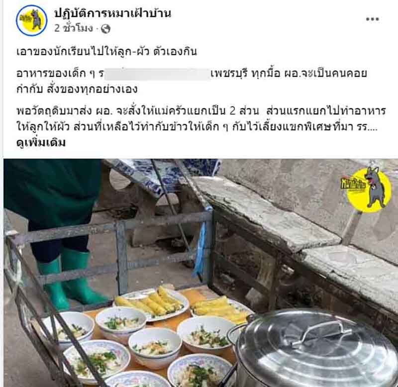 โดยระบุว่า "เอาของนักเรียนไปให้ลูก-ผัว ตัวเองกิน อาหารของเด็ก ๆ …. เพชรบุรี ทุกมื้อ ผอ.จะเป็นคนคอยกำกับ สั่งของทุกอย่างเอง พอวัตถุดิบมาส่ง ผอ. จะสั่งให้แม่ครัวแยกเป็น 2 ส่วน ส่วนแรกแยกไปทำอาหารให้ลูกให้ผัว ส่วนที่เหลือไว้ทำกับข้าวให้เด็ก ๆ กับไว้เลี้ยงแขกพิเศษที่มา รร.