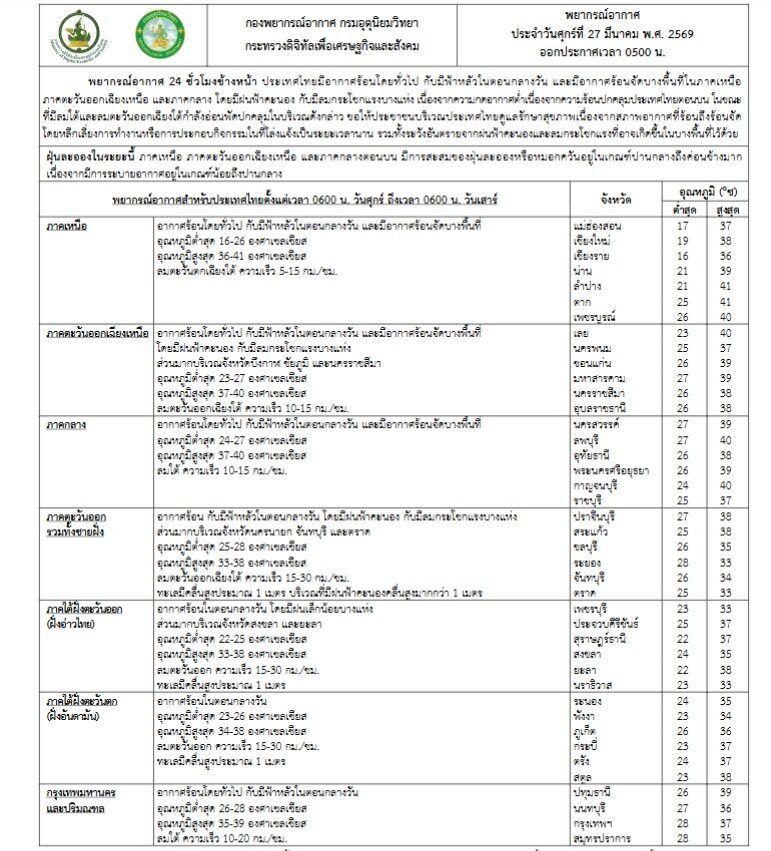วันที่ 27 มี.ค.2569 กรมอุตุนิยมวิทยา พยากรณ์อากาศ 24 ชั่วโมงข้างหน้า ประเทศไทยมีอากาศร้อนโดยทั่วไป กับมีฟ้าหลัวในตอนกลางวัน และมีอากาศร้อนจัดบางพื้นที่ในภาคเหนือ ภาคตะวันออกเฉียงเหนือ และภาคกลาง โดยมีฝนฟ้าคะนอง กับมีลมกระโชกแรงบางแห่ง เนื่องจากความกดอากาศต่ำเนื่องจากความร้อนปกคลุมประเทศไทยตอนบน ในขณะที่มีลมใต้และลมตะวันออกเฉียงใต้กำลังอ่อนพัดปกคลุมในบริเวณดังกล่าว