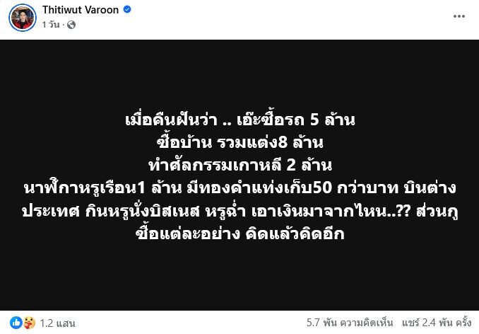 จากกรณี บิ๊ก ธิติวุฒิ วารุณ หรือ ผู้ใหญ่บ้านฟินแลนด์ โพสต์ฝันว่าเงินหายกว่า 10 ล้าน ขณะที่มีคนซื้อรถ 5 ร้าน บ้าน 8 ล้าน มีทองคำแท่ง 50 กว่าบาท ศัลยกรรมเกาหลี 2 ล้าน ชีวิตหรูฉ่ำ โดยโซเชียลต่างชี้เป้าถึงคนใกล้ชิด โกกิ หรือ นิษฐา วารุณ น้องต่างมารดาของ บิ๊ก ผู้ใหญ่บ้านฟินแลนด์ ที่ทำตัวเหมือนหงายการ์ดลบคลิปภาพบ้านหรูด้วยนั้น