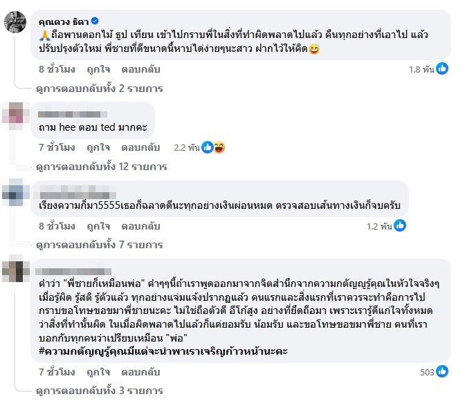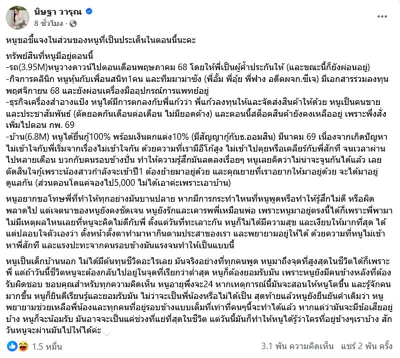 “หนูอายุเพิ่งจะ24 หากเหตุการณ์นี้มันจะสอนให้หนูโตขึ้น และรู้จักคนมากขึ้น หนูก็ยินดีเรียนรู้และยอมรับมัน ไม่ว่าจะเป็นพี่น้องหรือไม่ได้เป็น สุดท้ายแล้วหนูยังยืนยันคำเดิมว่า หนูพยายามช่วยเหลือพี่น้องและทุกคนที่อยู่รอบข้างแบบเต็มที่เท่าที่คนๆนี้จะทำได้แล้ว หากแต่ว่ามันจะมีข้อเสียอยู่บ้าง หนูก็จะน้อมรับ มันอาจจะเป็นแค่ช่วงที่แย่ที่สุดในชีวิต แต่วันนี้มันก็ทำให้หนูได้รู้ว่าใครที่อยู่ข้างๆเราบ้าง สักวันหนูจะผ่านมันไปให้ได้ค่ะ” ขณะที่คอมเมนต์ถาโถมถล่มอีกหนัก เหมือนถามอย่างตอบอย่าง พร้อมทั้งแนะให้ไปขอขมาพี่ชาย