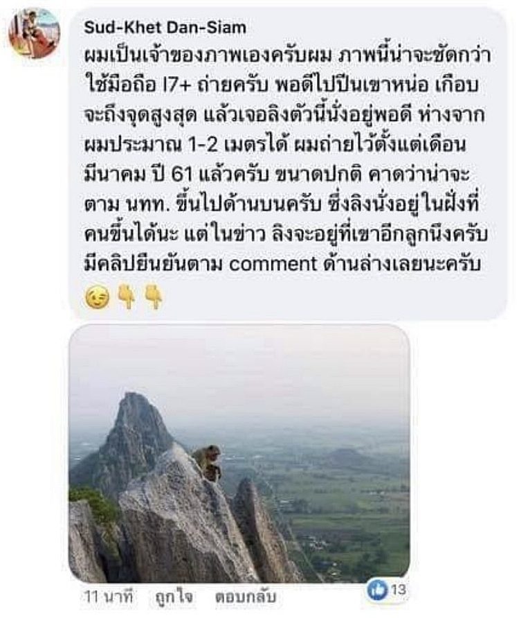 เมื่อวันที่ 29 ก.ย. ผู้สื่อข่าวรายงานว่า ผู้ใช้เฟซบุ๊กชื่อ Sud-Khet Dan-Siam ซึ่งเป็นผู้ถ่ายภาพลิงนั่งอยู่บนยอดเขาหน่อ พร้อมระบุว่า ภาพดังกล่าวถ่ายไว้ตั้งแต่เดือนมีนาคม 2561 ระหว่างตนเองไปปีนเขาหน่อจุดเกือบสูงที่สุด พบลิงตัวดังกล่าวนั่งอยู่ห่างจากตัวเองประมาณ 1-2 เมตร จึงถ่ายภาพเก็บไว้ นอกจากนี้ ขนาดของลิงยังเป็นปกติคาดว่าน่าจะตามเจ้าหน้าที่ขึ้นไปด้านบน ซึ่งลิงนั่งอยู่ในฝั่งที่คนขึ้นไปได้ แต่ที่ปรากฏในข่าวนั้นลิงจะอยู่ที่เขาอีกลูก