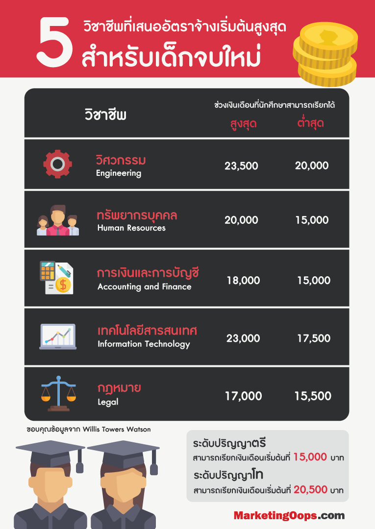 อัพเดต 29 พ.ย. 2560 เวลา 11.49 น. • เผยแพร่ 29 พ.ย. 2560 เวลา 04.47 น. • Marketing Oops!น้อง ๆ นักศึกษารู้หรือไม่ว่าสาขาที่ตรากตรําตั้งใจเรียนอยู่นั้น จบมาแล้วได้รับเงินเดือนเท่าไหร่? โดยปกติเรทเงินเดือนส่วนใหญ่ของนักศึกษาจบใหม่ระดับปริญญาตรีจะอยู่ที่ 15,000 บาท(ตามที่กฎหมายกำหนด) แต่ยังมีบางสาขาวิชาที่สามารถเรียกอัตราเงินเดือนได้สูงกว่า วันนี้จึงชวนมาดูกันชัด ๆ ไปเลยว่าอาชีพไหนบ้างที่สามารถเรียกเงินเดือนได้สูงแม้เป็นนักศึกษาจบใหม่