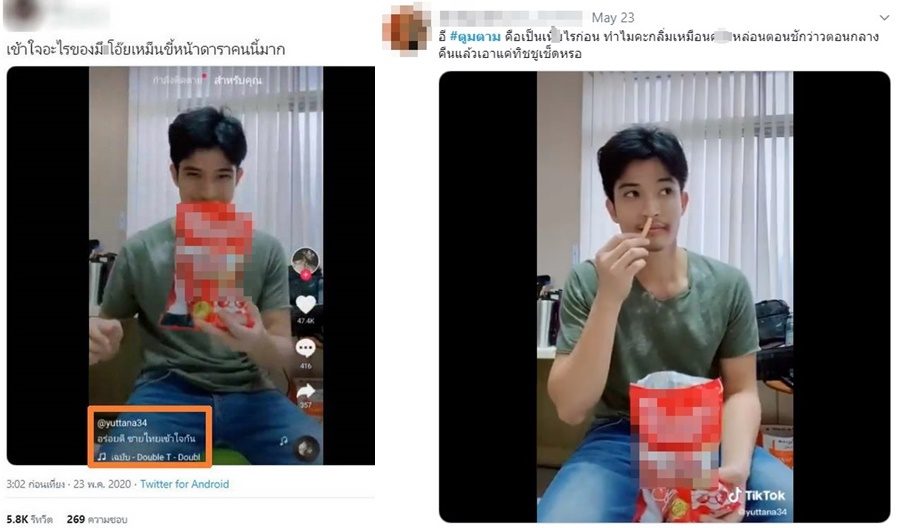 โดยในคลิป หนุ่มตูมตาม กำลังนั่งกินข้าวเกรียบกุ้งยี่ห้อดังในอยู่ ระหว่างนั้นก็หยิบขึ้นมาดม ทำหน้าแปลกๆก่อนอมยิ้ม อีกทั้งยังได้ให้แคปชั่นคลิปนี้ไว้ว่า “อร่อยดี ชายไทยเข้าใจกัน”