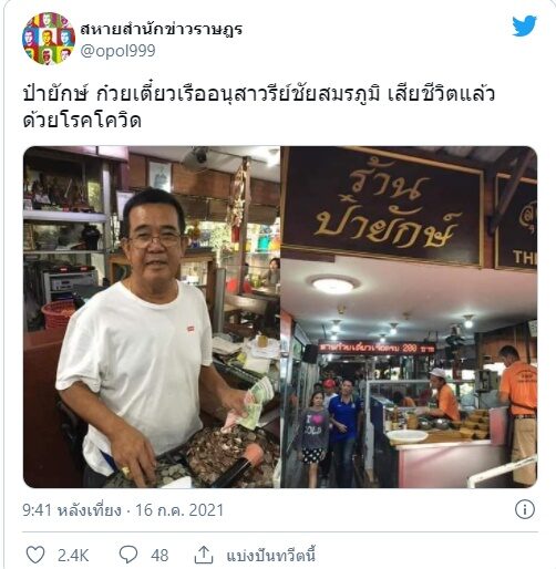 ล่าสุดผู้สื่อข่าวรายงานว่า ทวิตเตอร์ของสหายสำนักข่าวราษฎร เปิดเผยข่าวเศร้าที่เกิดขึ้นอีกแล้ว โดยระบุว่า “ป๋ายักษ์ ก๋วยเตี๋ยวเรืออนุสาวรีย์ชัยสมรภูมิ เสียชีวิตแล้ว ด้วยโรคโควิด” ซึ่งมีประชาชนและลูกค้าเข้ามาคอมเมนต์แสดงความเสียใจ