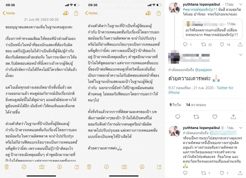 ก่อนจะมีคนเข้ามาเขียนข้อความยาววิจารณ์ค่อนข้างแรงว่า เรื่องทรงผมสีผมนักแสดงต้องรับผิดชอบ รวมทั้งผู้จัด เมื่อเกิดเหตุเลยเถิด ผู้จัดควรน้อมรับความผิดพลาด