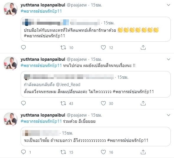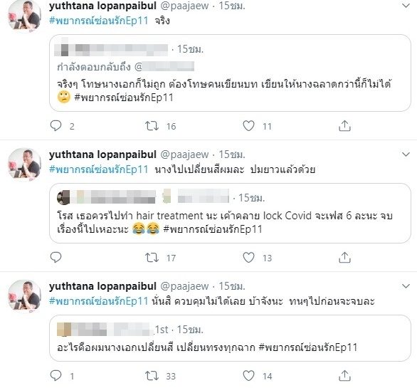 ขณะที่มีคนวิจารณ์อีกว่า “อะไรคือผมนางเอกเปลี่ยนสี เปลี่ยนทรงทุกฉาก” ป้าแจ๋ว ก็เข้ามารีทวีตตอบอีกว่า “นั่นสิ ควบคุมไม่ได้เลย บ้าจังนะ ทนๆไปก่อนจะจบละ”