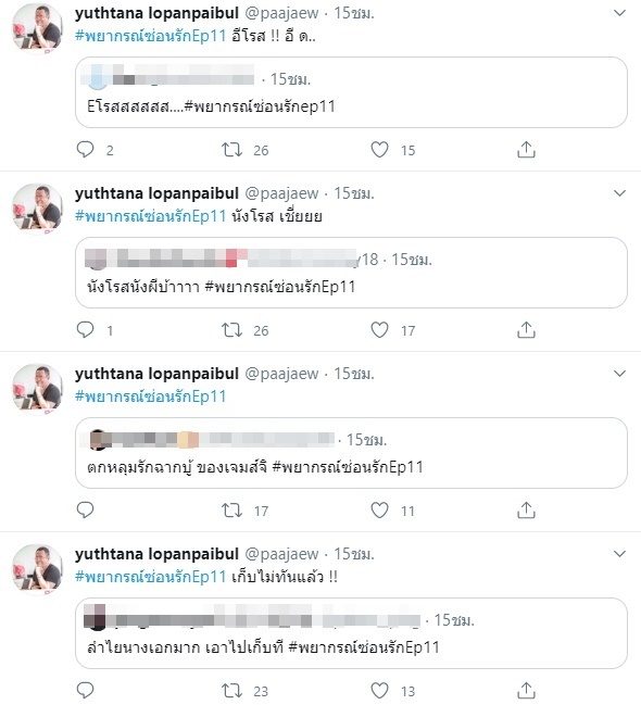 โรส เข้าไปขวาง ธีรุตม์ พระเอก หลายครั้งจนเกือบจะพลาดถูกคนร้ายฆ่า จนมีคนอินหนักทวีตด่า อาทิ “จะเป็นอะไรมั้ย ถ้าจะบอกว่า อีโง่วววววววววววว” , “Eโรสสสสสส….” , “นังโรสนังผีบ้าาาา” เป็นต้น ซึ่งป้าแจ๋ว ก็เข้าไปรีทวีตด้วยแบบติดตลก