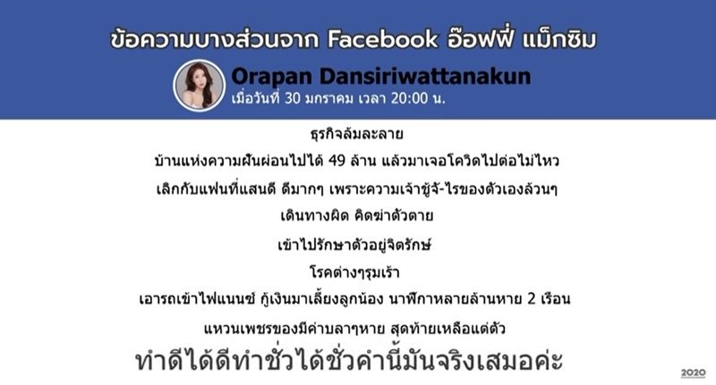 จากมหาเศรษฐีเน็ตไอดอลสู่จุดไม่เหลืออะไร ออฟฟี่ บอกว่า “ล้มละลายกับสิ่งที่สร้างมาทั้งหมด แต่ยังมีกินมีใช้ต่อไปได้ แต่สูญเสียสิ่งที่สร้างมา และสูญเสียอีกหลายๆอย่าง สูญเสียสามี และเพื่อนไป สูญเสียสังคมรอบข้าง ต้องอยู่กับตัวเอง”