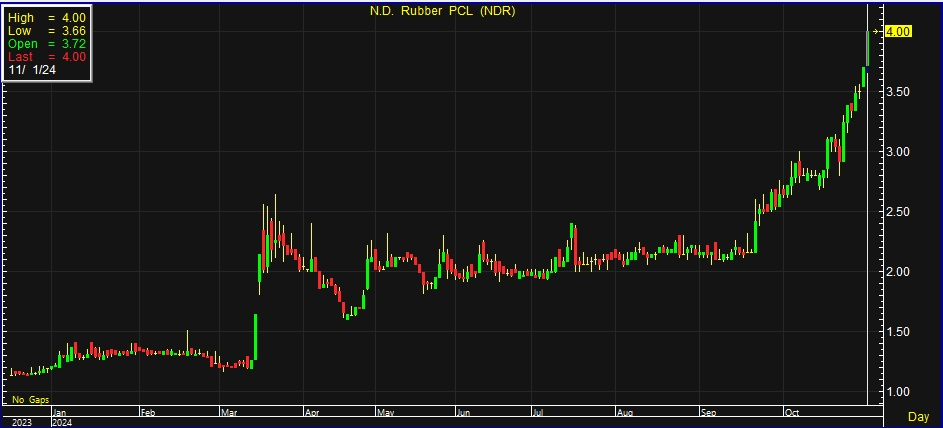 ผู้สื่อข่าวรายงานว่า วันนี้ (1 พ.ย.67) ราคาหุ้น บริษัท เอ็น.ดี.รับเบอร์ จำกัด (มหาชน) หรือ NDR ปิดตลาดวันนี้ที่ระดับ 4 บาท บวก 0.30 บาท หรือ 8.11% สูงสุดที่ระดับ 4 บาท ต่ำสุดที่ระดับ 3.66 บาท ด้วยมูลค่าการซื้อขาย 54.93 ล้านบาท โดยราคาหุ้นปรับตัวเพิ่มขึ้นทำจุดสูงสุดใหม่ในรอบกว่า 7 ปี นับตั้งแต่ราคาหุ้นปิดที่ระดับ 4.02 บาท เมื่อวันที่ 10 ส.ค.60