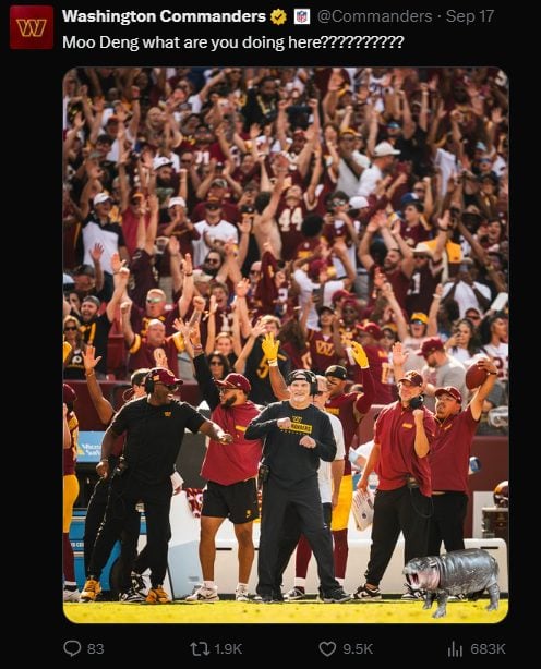 อย่างไรก็ตาม การตัดต่อหมูเด้งไปทำเป็นมีมของบาเยิร์น มิวนิค นั้นไม่ใช่ทีมแรก โดยก่อนหน้านี้ ด้านทีม วอชิงตัน คอมมานเดอร์ส ทีมอเมริกันฟุตบอลชื่อดัง ก็ได้ตัดต่อภาพหมูเด้งไปใส่ภาพทีมของพวกเขาขณะฉลองชัยชนะเช่นกัน พร้อมแคปชันที่แปลเป็นไทยว่า “หมูเด้ง หนูมาทำอะไรที่นี่????”