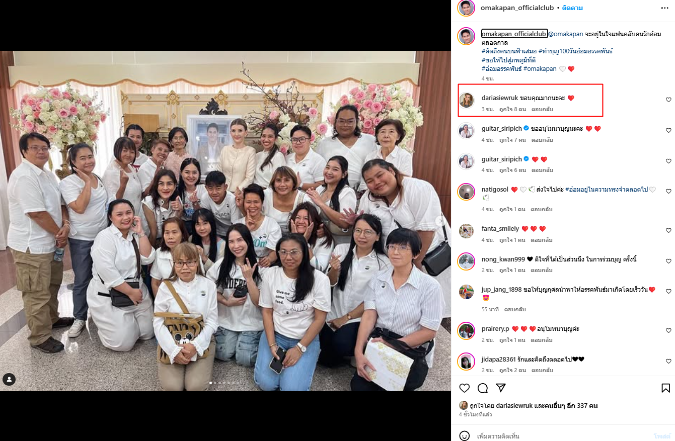 โดย กีต้าร์ ศิริพิชญ์ พี่สาวคนสนิทของ อ๋อม ที่รักและเอ็นดู ดาเรีย เหมือนน้องสาว ได้โพสต์ภาพบรรยากาศ ทำบุญ 100 วันให้กับอ๋อม พร้อมเขียนแคปชั่นว่า “เอาบุญมาฝากค่ะ ❤️ อยู่ในหัวใจเสมอ #คิดถึงนะครับ”