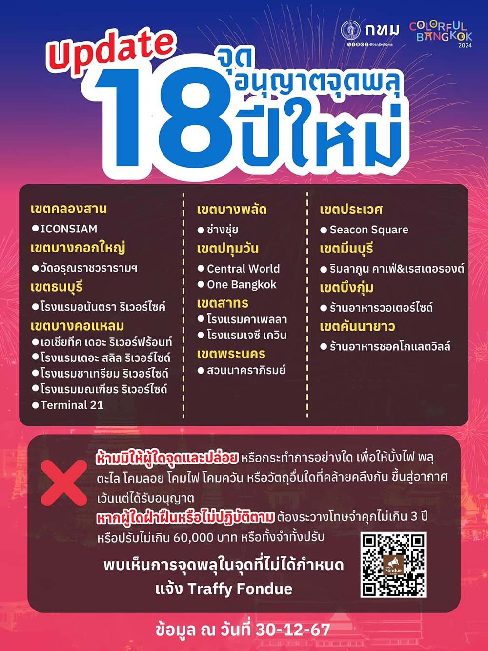 กทม. อัพเดต 18 จุด อนุญาตจุดพลุปีใหม่ 2568 ฝ่าฝืนโทษสูงสุดคุก 3 ปี ปรับ 6 หมื่นบาท