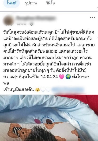 พร้อมข้อความ "ป๊าไม่ใช่ผู้ชายที่ดีที่สุด แต่ป๊าจะเป็นพ่อและผู้ชายที่ดีที่สุดสำหรับลูกนะ ถึงลูกป๊าจะไม่ได้น่ารักสำหรับคนอื่นเสมอไป แต่ลูกชายคนนี้น่ารักที่สุดสำหรับพ่อเสมอ แต่ก่อนห่วงอะไรมากมาย เดี๋ยวนี้ไม่เคยห่วงอะไรมากกว่าลูก ทำงานมาหนัก ๆ ได้เห็นรอยยิ้มลูกก็ชื่นใจแล้ว การตื่นเช้ามาเจอหน้าลูกชายในทุก ๆ วัน คือสิ่งที่ทำให้ป๊ามีความสุขที่สุดในชีวิต"