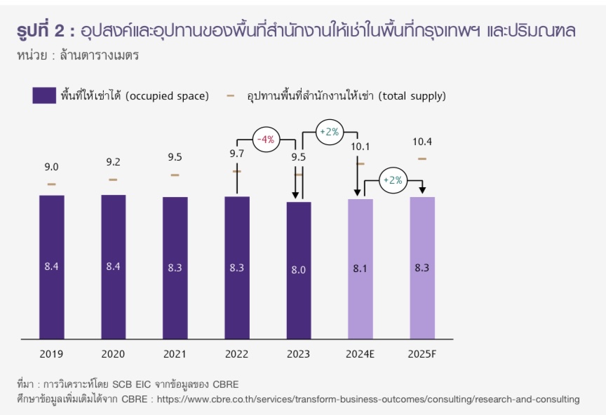 SCB EIC เปิดเผยว่า ซัพพลายออฟฟิศให้เช่าใหม่เพิ่มขึ้นต่อเนื่อง โดยปี 2568 คาดมีพื้นที่รวม 10.4 ล้านตร.ม. จากปี 2567 มีพื้นที่ 10.1 ล้านตร.ม.