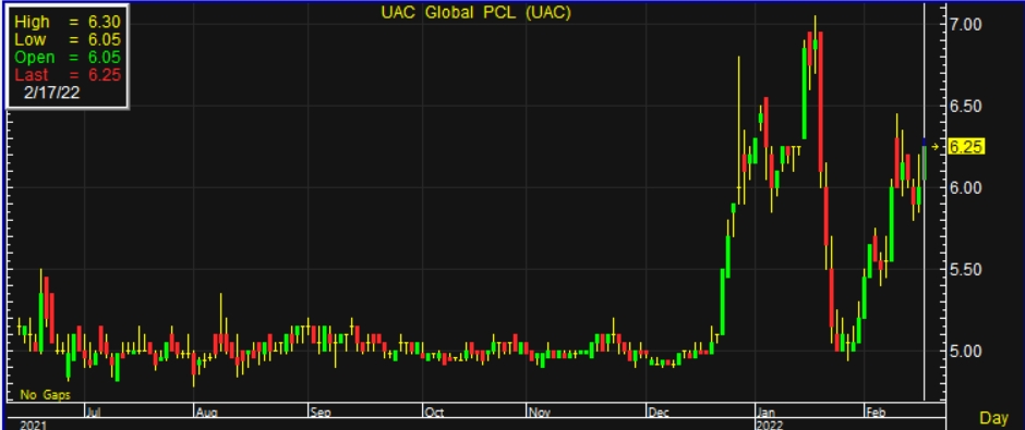 ผู้สื่อข่าวรายงานว่า ราคาหุ้น บริษัท ยูเอซี โกลบอล จำกัด (มหาชน) หรือ UAC ณ เวลา 10:35 น. อยู่ที่ระดับ 6.25 บาท บวก 0.25 บาท หรือ 4.17% สูงสุดที่ระดับ 6.30 บาท ต่ำสุดที่ระดับ 6.05 บาท ด้วยมูลค่าการซื้อขาย 11.52 ล้านบาท