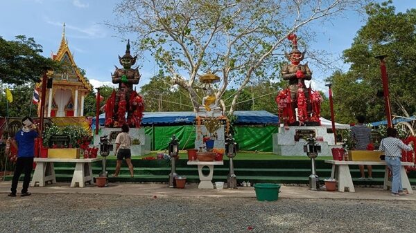วันที่ 2 ธ.ค.2566 ผู้สื่อข่าวเดินทางไปที่วัดเนินสุข(วัดละโอก) ม.9 ต.ทุ่งควายกิน อ.แกลง จ.ระยอง หลังจากทราบข่าวว่า มีผู้ถูกรางวัลที่ 1 และ รางวัลที่ 4 เตรียมมาแก้บนกับ ท้าวเวสสุวรรณ หลังขอพรแล้วได้รับโชคใหญ่