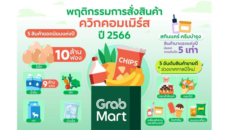 พฤติกรรมการสั่งซื้อสินค้าในชีวิตประจำวันผ่านGrabMart ประจำปี 2566 พบว่า 5 สินค้ายอดนิยมที่ผู้ใช้บริการสั่งตลอดทั้งปี ได้แก่