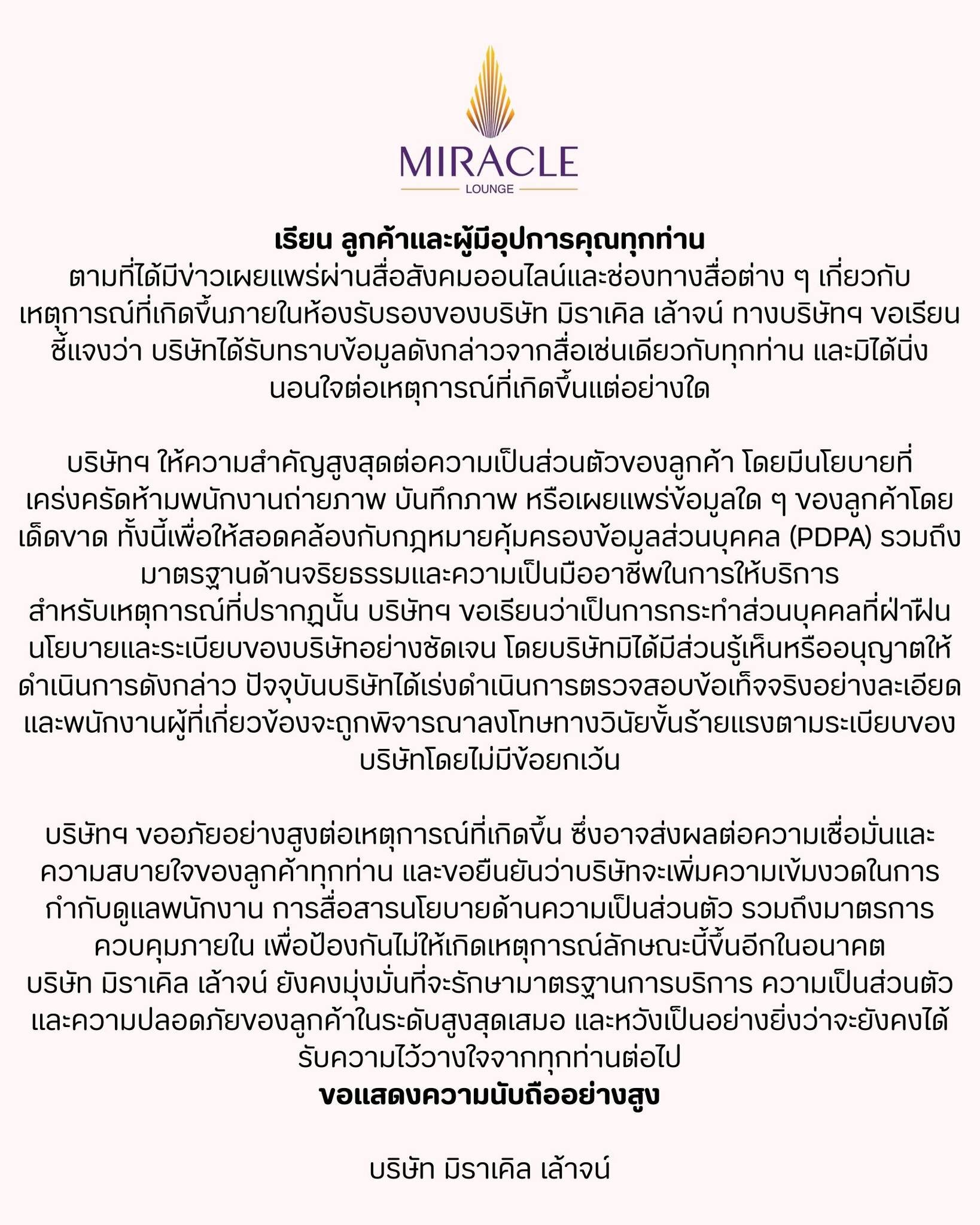 วันที่ 14 ก.พ.2569 เพจเฟซบุ๊ก Miracle Longe ออกแถลงการณ์ เรียนลูกค้าและผู้มีอุปการคุณทุกท่าน ตามที่ได้มีข่าวเผยแพร่ผ่านสื่อสังคมออนไลน์และช่องทางสื่อต่างๆ เกี่ยวกับเหตุการณ์ที่เกิดขึ้นภายในห้องรับรองของบริษัท มิราเคล เล้าจน์ ทางบริษัทฯ ขอเรียนชี้แจงว่า บริษัทได้รับทราบข้อมูลดังกล่าวจากสื่อเช่นเดียวกับทุกท่าน และมิได้นิ่งนอนใจต่อเหตุการณ์ที่เกิดขึ้นแต่อย่างใด