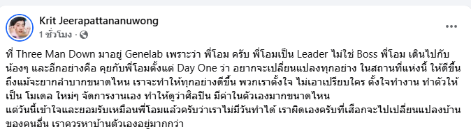 ล่าสุด กิต นักร้องนำวง three man down โพสต์เฟซบุ๊ก Krit Jeerapattananuwong ระบุว่า ที่ Three Man Down มาอยู่ Genelab เพราะว่า พี่โอม ครับ พี่โอมเป็น Leader ไม่ใช่ Boss