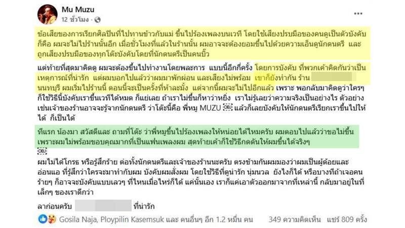 อ่านข่าวต้นฉบับได้ที่ : หมู MUZU ระบายความในใจ หลังพาแม่ไปทานข้าว แต่เจอร้านกดดันให้ขึ้นไปร้องเพลง