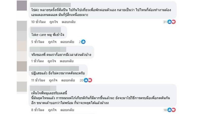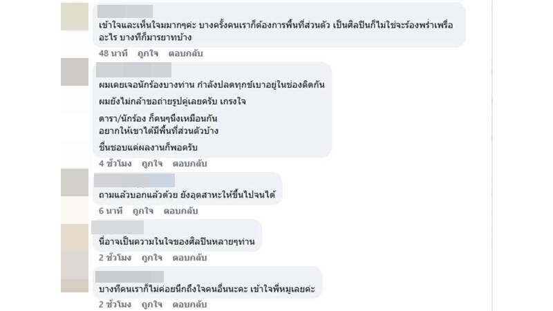 ท่ามกลางแฟนๆ ที่เข้ามาแสดงความคิดเห็นกันอย่างมากมาย ส่วนใหญ่บอกว่าเห็นใจและเข้าใจความรู้สึกของนักร้องดัง เพราะบางครั้งศิลปินก็อยากจะมีเวลาพักผ่อนส่วนตัวบ้าง อาทิ เข้าใจความรู้สึกครับพี่, ใช่ค่ะ หลายๆ ครั้งที่ศิลปิน ไปกินไปเที่ยวเพื่อพักผ่อนตัวเอง กลายเป็นว่าไปไหนก็ต้องทำงานต้องเอนเตอร์เทนตลอด มันก็รู้สึกเหนื่อยเนาะ,