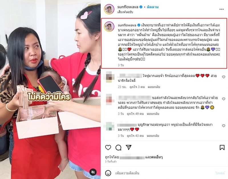 ล่าสุด เอวา ก็ได้โพสต์คลิป(ชมคลิป) ลงในอินสตราแกรม @sunflowava การเป็นผู้ให้มอบของให้เป็นกำลังแก่เหล่าคนสู้ชีวิต แม่สู้ชีวิตคนหนึ่งที่หาเงินเพื่อรักษาลูกสาว พร้อมกับข้อความเผยที่มาของคำว่า “คุณหนูหมื่นล้าน” พร้อมกับแจงเงินทุกบาทที่ทําคลิปการให้ได้มาจากไหน ?