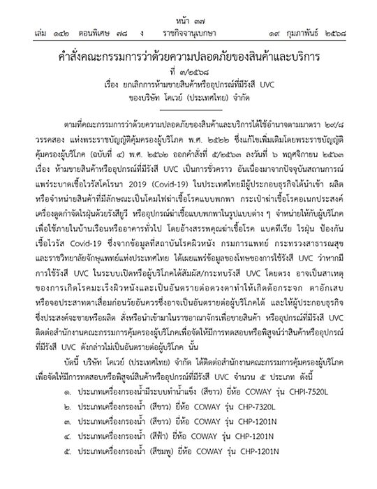 จึงมีคำสั่งให้แก้ไขคำสั่งคณะกรรมการว่าด้วยความปลอดภัยของสินค้าและบริการ ที่ 5/2563 ลงวันที่ ๖ พฤศจิกายน 2563 เรื่อง ห้ามขายสินค้าหรืออุปกรณ์ที่มีรังสี UVC เป็นการชั่วคราว โดยให้ยกเลิกการห้ามขายสินค้าหรืออุปกรณ์ที่มีรังสี UVC ของบริษัท โคเวย์ (ประเทศไทย) จำกัด จำนวน 5 ประเภท ได้แก่