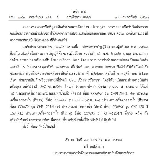 วันที่ 20 ก.พ.2568 ผู้สื่อข่าวรายงานว่า เว็บไซต์ ราชกิจจานุเบกษา เผยแพร่ คำสั่งคณะกรรมการว่าด้วยความปลอดภัยของสินค้าและบริการ ที่ 3/2568 เรื่อง ยกเลิกการห้ามขายสินค้าหรืออุปกรณ์ที่มีรังสี UVC ของบริษัท โคเวย์ (ประเทศไทย) จำกัด ระบุว่า