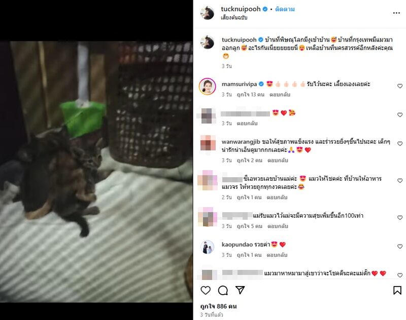 ตั๊ก ศิริพร โพสต์คลิปน้องแมว แคปชั่นว่า“บ้านที่พิษณุโลกมีงูเข้าบ้าน บ้านที่กรุงเทพมีแมวมาออกลูกอะไรกันเนี่ยยยยยยนี่ เหลือบ้านที่นครสวรรค์อีกหลังค่ะคุณ” โดยมีแต่คอมเมนต์ให้รับดูแลไว้ แมวให้โชค
