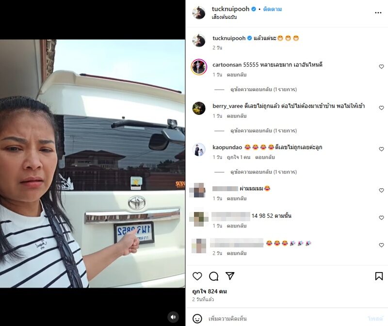 ล่าสุด ตั๊ก ยังโพสต์คลิปโชว์เลขทะเบียนรถตู้ แคปชั่น “แล้วแต่นะ” เล่าว่ามีงูตัวหนึ่งเข้าบ้านที่พิษณุโลก แล้วบ้านที่กรุงเทพฯ มีแมวมาคลอดลูกในรถที่บ้าน แมวคลอดลูกในรถตู้คันนี้ ในห้องเครื่องรถ คลอดทั้งหมด 4 ตัว งูเข้าบ้าน 1 ตัว แมวมาคลอด 4 ตัว ในรถตู้พี่คันนี้