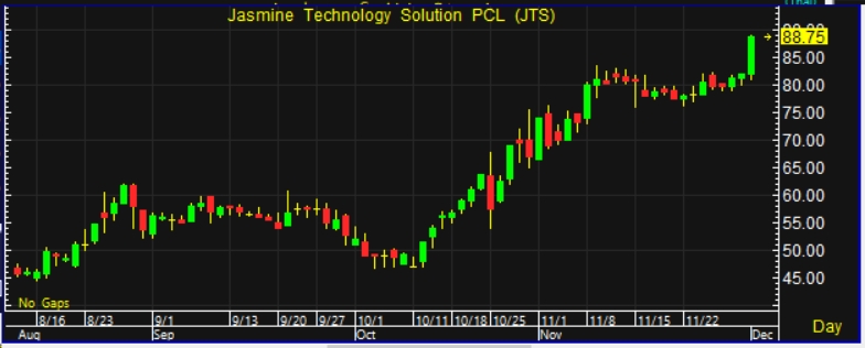 ผู้สื่อข่าวรายงานว่า วันนี้(1ธ.ค.64) ราคาหุ้นบริษัท จัสมิน เทคโนโลยี โซลูชั่น จำกัด (มหาชน) หรือ JTS ณ เวลา 15:26 น.อยู่ที่ระดับ 88.75 บาท บวก 6.75 บาท หรือ 8.23 % ด้วยมูลค่าซื้อขาย 106.16 ล้านบาท ราคาหุ้นนิวไฮรอบ 6 เดือน โดยเทียบตั้งแต่หุ้นยืนที่ระดับ 2.30 บาท เมื่อวันที่ 19 พ.ค. 2564 ราคาหุ้นนิวไฮตั้งแต่เข้าตลาดเมื่อวันที่ 18 ก.ย.2549