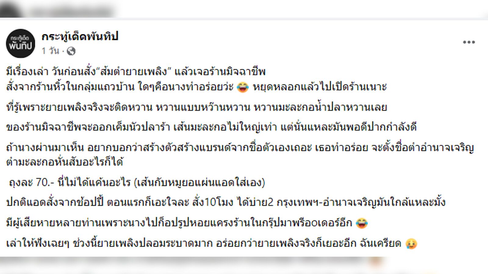 เพจดังสั่งซื้อ 'ส้มตำยายเพลิง' ร้านเด็ด แต่กินปุ๊บรู้ปั๊บว่าของปลอม เหตุรสชาติไม่เป็นเอกลักษณ์ ลั่นถ้าจะตำแซ่บนัวขนาดนี้ เลิกเป็นมิจฯ แล้วไปเปิดร้านเถอะ