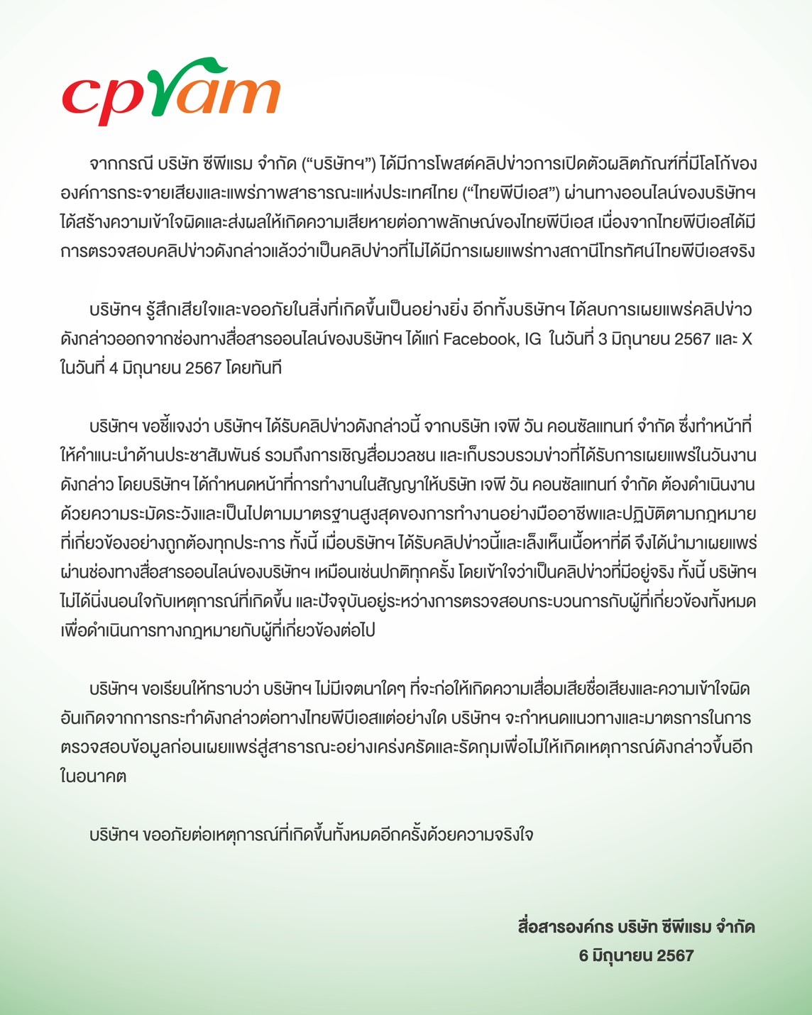 วันที่ 6 มิถุนายน 2567 ผู้สื่อข่าวรายงานว่า บริษัท ซีพีแรม จำกัด โพสต์ผ่านเฟซบุ๊ก CPRAM ระบุว่า จากกรณีบริษัทได้มีการโพสต์คลิปข่าวการเปิดตัวผลิตภัณฑ์ที่มีโลโก้ขององค์การกระจายเสียงและแพร่ภาพสาธารณะแห่งประเทศไทย (ไทยพีบีเอส) ผ่านทางออนไลน์ของบริษัทได้สร้างความเข้าใจผิดและส่งผลให้เกิดความเสียหายต่อภาพลักษณ์ของไทยพีบีเอส