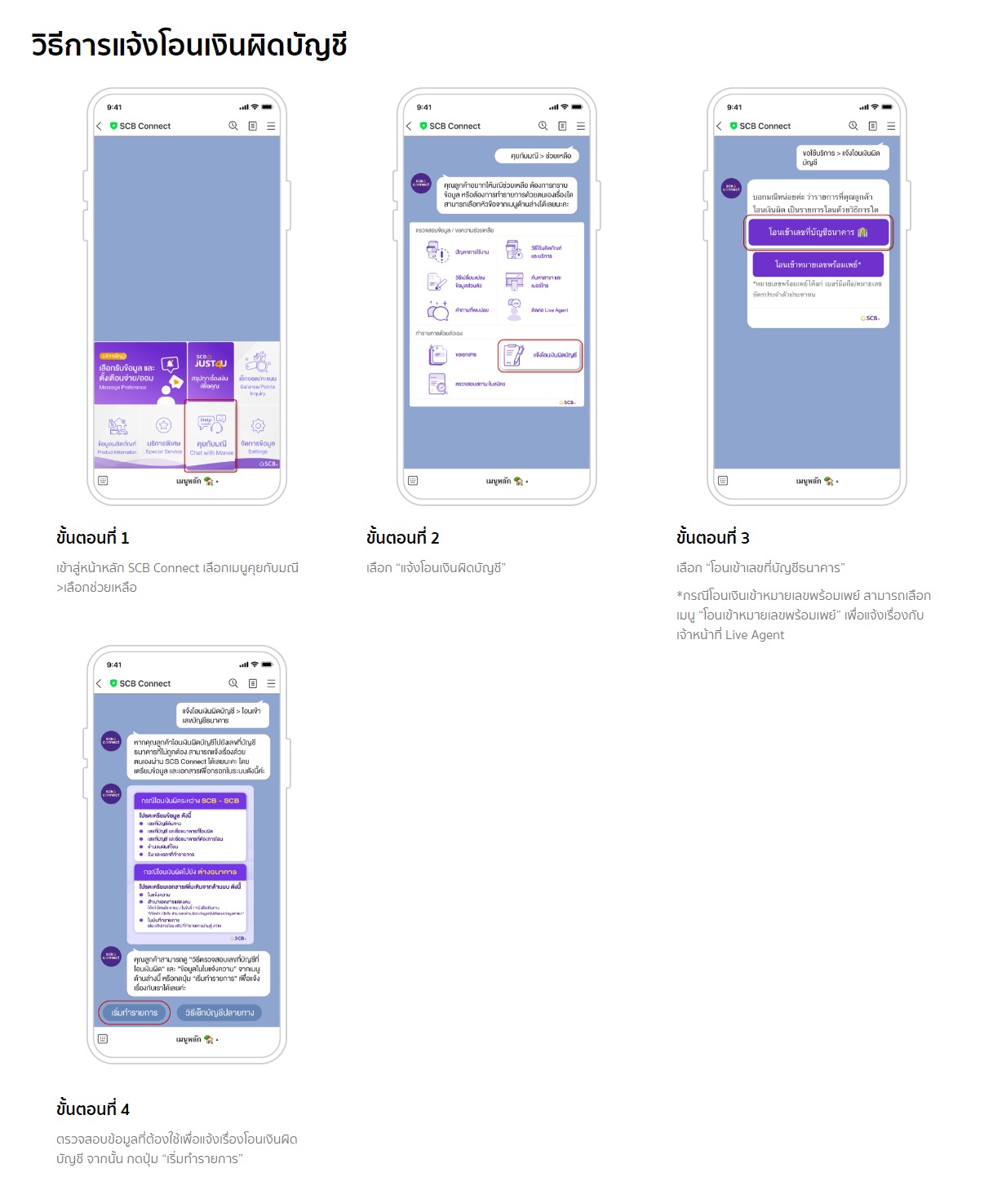 ล่าสุด ธนาคารไทยพาณิชย์ ประชาสัมพันธ์ผ่าน Line Offical Acoount ของธนาคาร เพิ่มช่องทางใหม่ในการแจ้งปัญหาการโอนเงินผิดบัญชี ผ่านทาง Line Official SCB Connect โดยรองรับทั้งการแจ้งโอนผิดบัญชี กรณีโอนผ่านบัญชีธนาคาร และกรณีโอนผ่านหมายเลขพร้อมเพย์