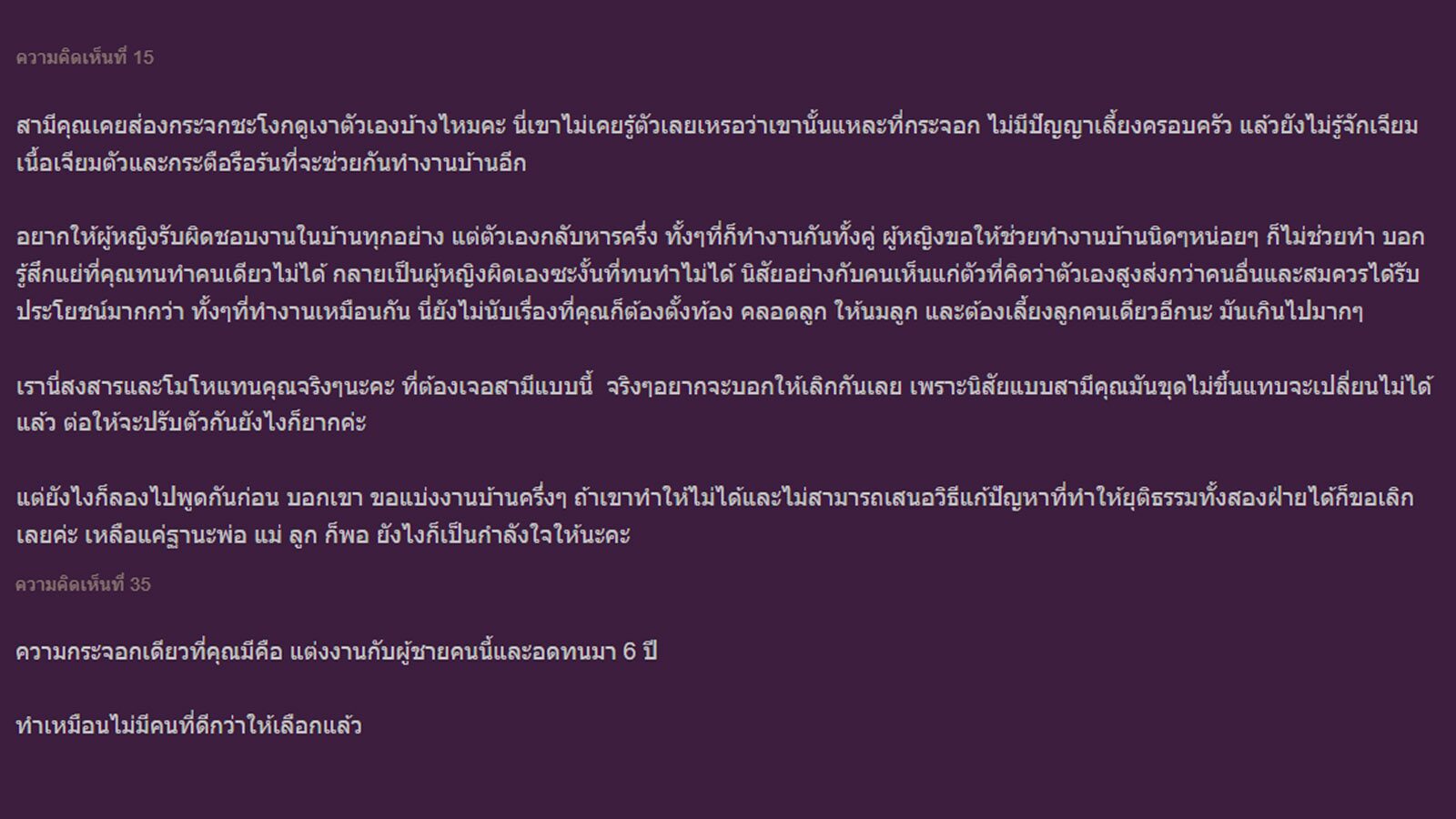 ด้านความคิดเห็นชาวเน็ตนั้น ต่างรุมวิจารณ์สามีที่เอาเปรียบภรรยา โดยมองว่าค่าใช้จ่ายทุกอย่างสามารถหารสอง แล้วทำไมงานบ้านถึงไม่หาร หรือช่วยกันทำบ้าง นอกจากนี้เจ้าของกระทู้และสามีต่างมีงานประจำด้วยกันทั้งคู่ เท่ากับภาระงานเท่า ๆ กัน แล้วเหตุใดภรรยาถึงต้องเหนื่อยฝ่ายเดียว