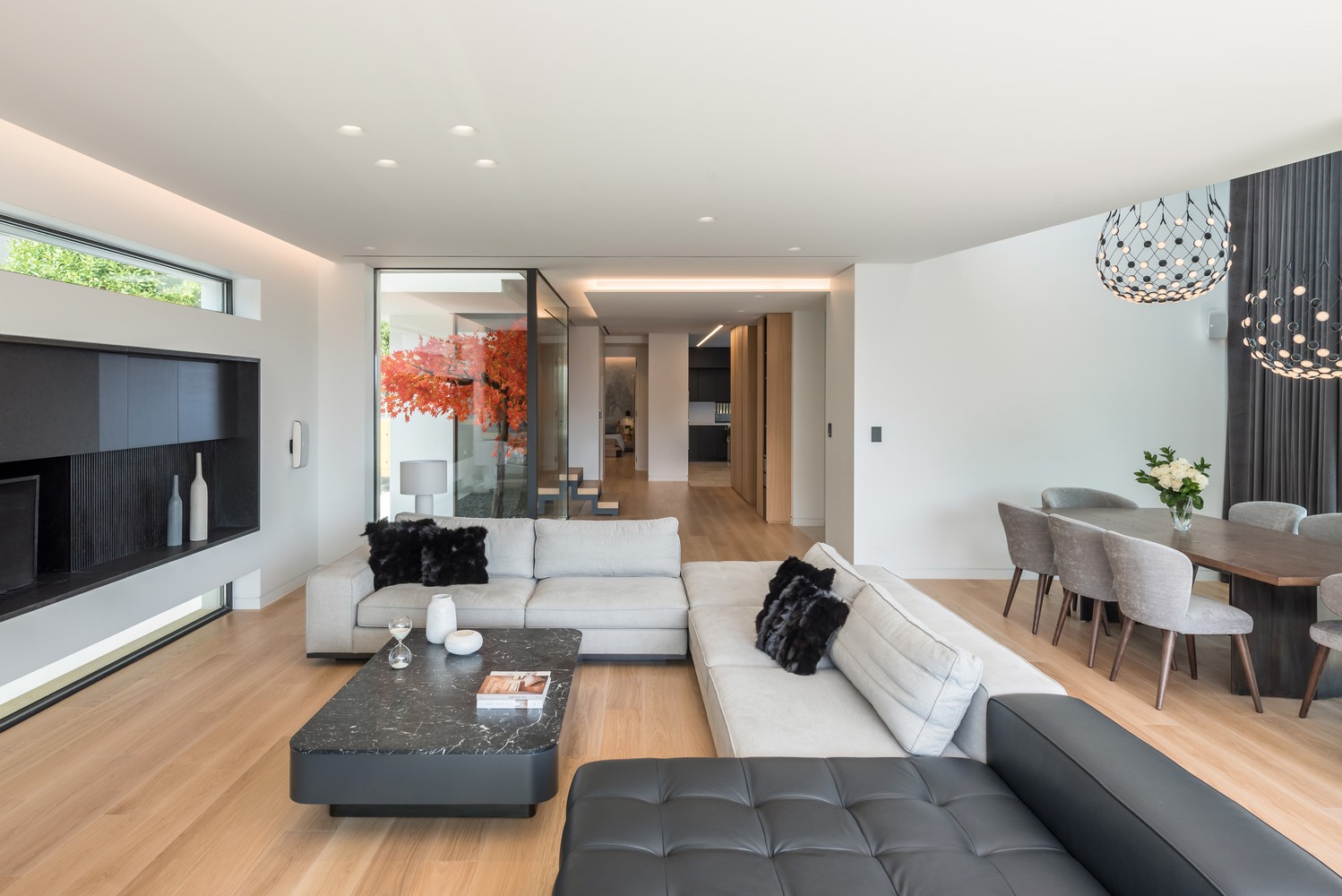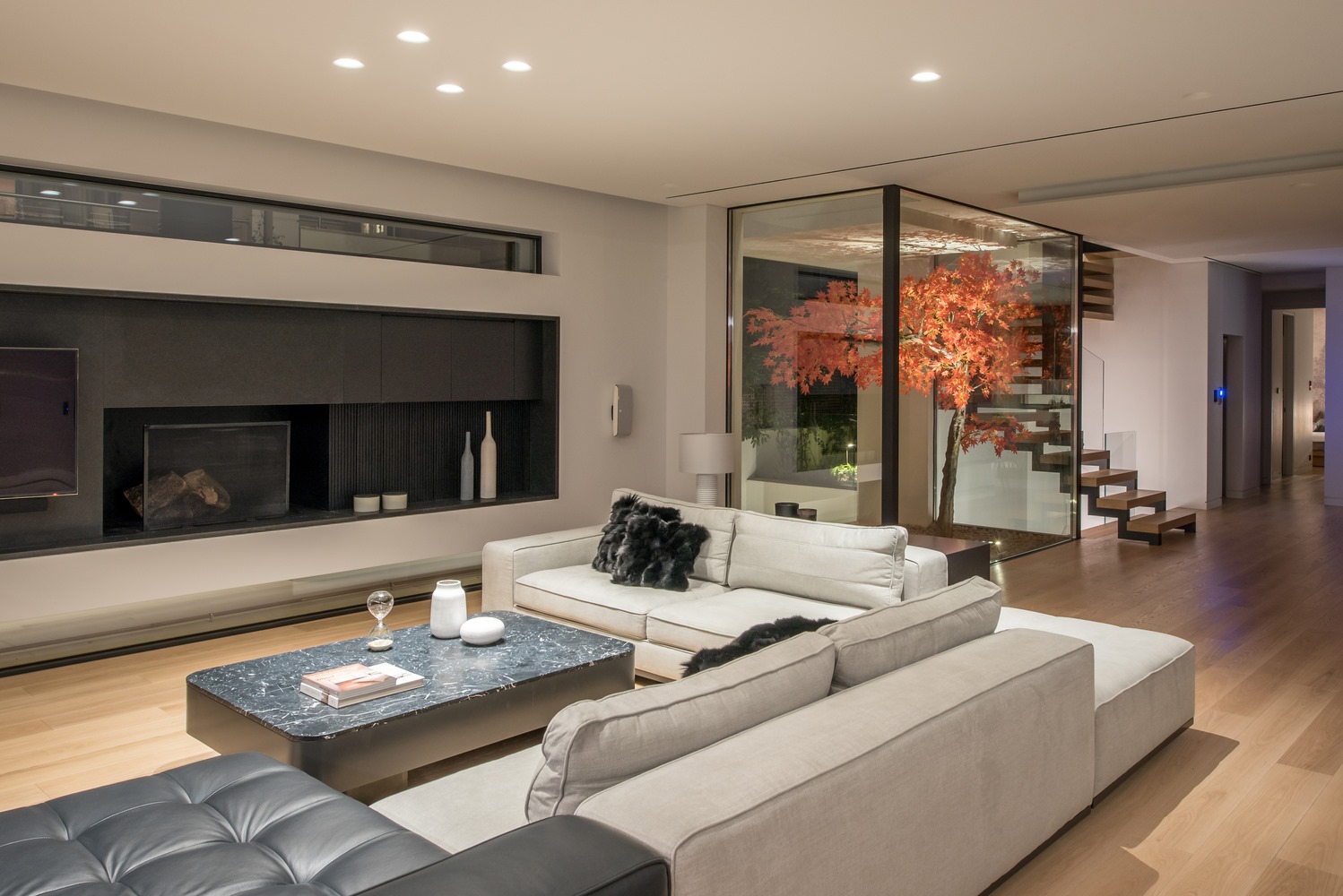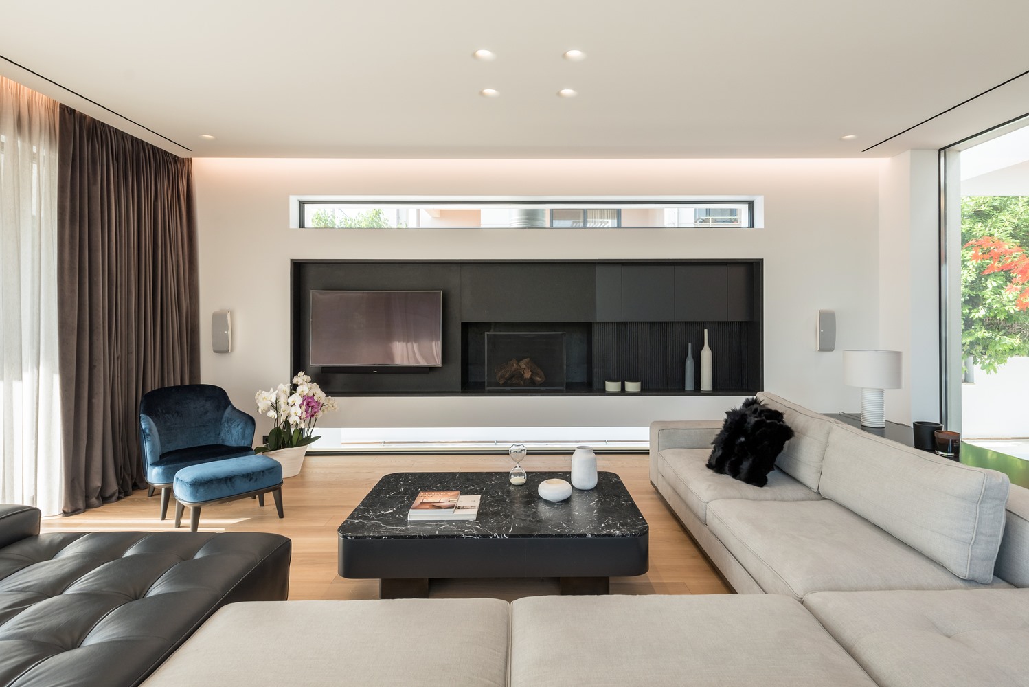 ภายในบ้านจะออกแบบให้เหมาะกับภูมิอากาศของประเทศกรีซ ซึ่งในห้องนั่งเล่นจะมีการนำเตาผิงมาตกแต่งสวยงามให้เข้ากับเฟอร์นิเจอร์อื่นๆ โดยส่วนใหญ่จะเลือกใช้โทนสีดำผสมผสานกับโทนสีสว่างอย่างสีขาว และสีน้ำตาลอ่อน นอกจากนี้รอบๆ บ้านยังตกแต่งด้วยกระจกใสบานใหญ่ทำให้เห็นสระว่ายน้ำหน้าบ้าน หรือวิวทิวทัศน์ได้อย่างเต็มที่ รวมถึงในช่วงกลางคืนการเลือกใช้ไฟโทนสีส้ม หรือวอร์มไวท์ก็ทำให้ตัวบ้านดูอบอุ่นยิ่งขึ้น อย่างไรก็ตามบ้านแบบนี้ก็ควรสร้างในพื้นที่ที่ไม่ติดกับคนอื่นมากเกินไป เพื่อความเป็นส่วนตัว