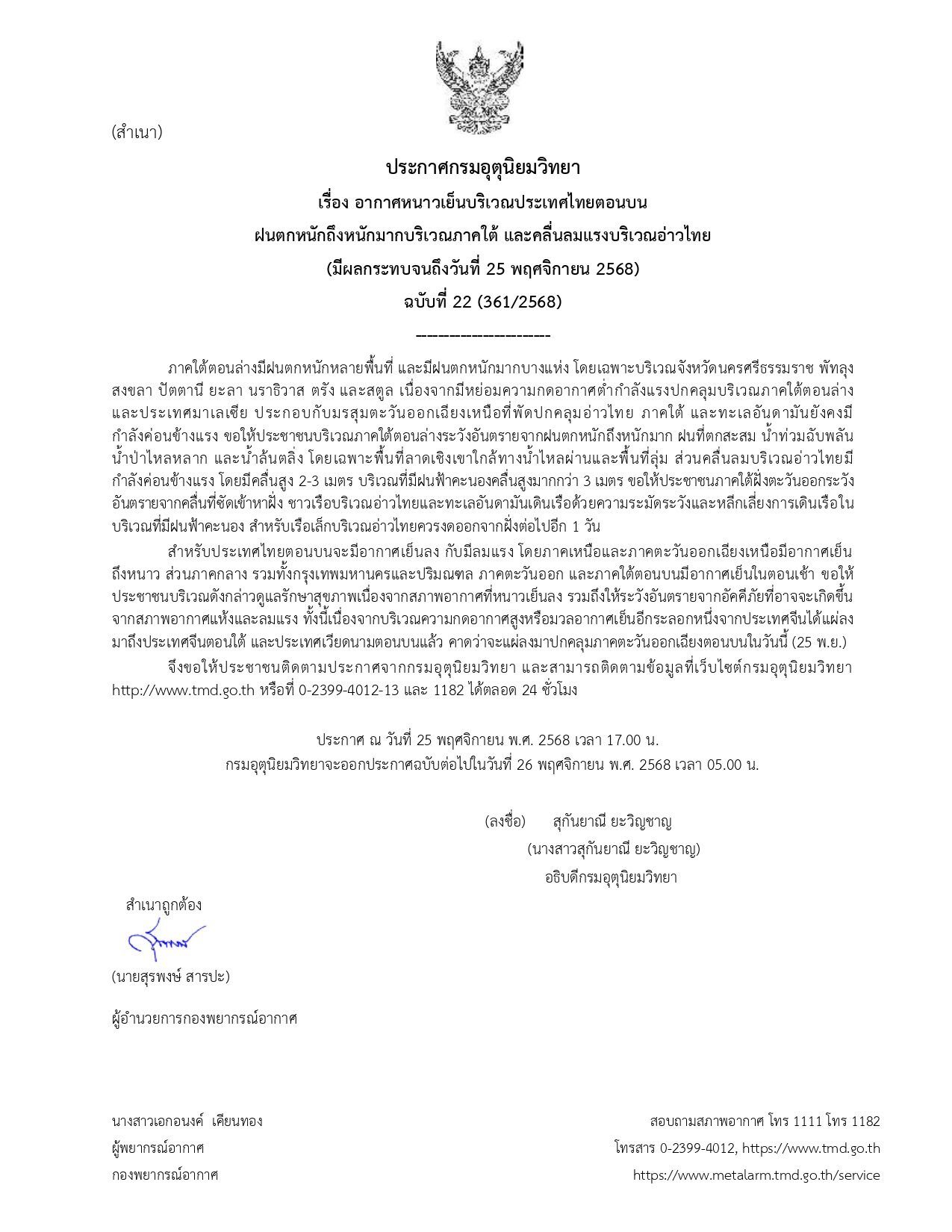 กรมอุตุนิยมวิทยา ประกาศฉบับที่ 22 เรื่อง อากาศหนาวเย็นบริเวณประเทศไทยตอนบน ฝนตกหนักถึงหนักมากบริเวณภาคใต้ และคลื่นลมแรงบริเวณอ่าวไทย (มีผลกระทบจนถึงวันที่ 25 พฤศจิกายน 2568)