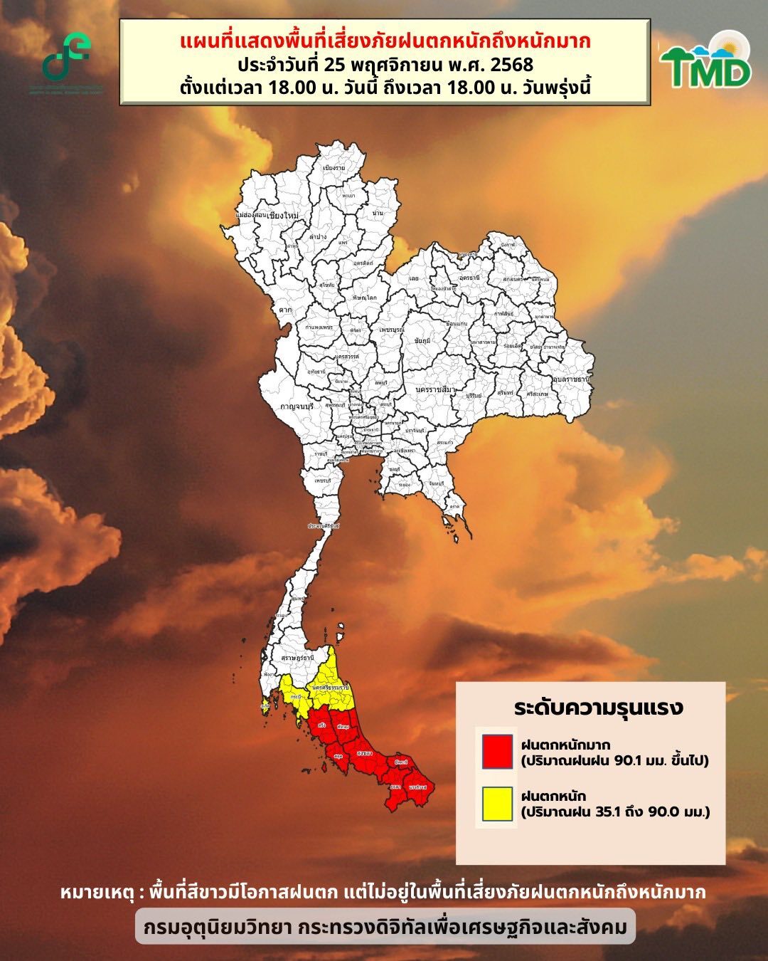 วันที่ 25 พ.ย.2568 กรมอุตุนิยมวิทยา ประกาศกรมอุตุนิยมวิทยา เรื่อง อากาศหนาวเย็นบริเวณประเทศไทยตอนบน ฝนตกหนักถึงหนักมากบริเวณภาคใต้ และคลื่นลมแรงบริเวณอ่าวไทย (มีผลกระทบจนถึงวันที่25 พฤศจิกายน 2568) ฉบับที่ 22(361/2568) ความว่า