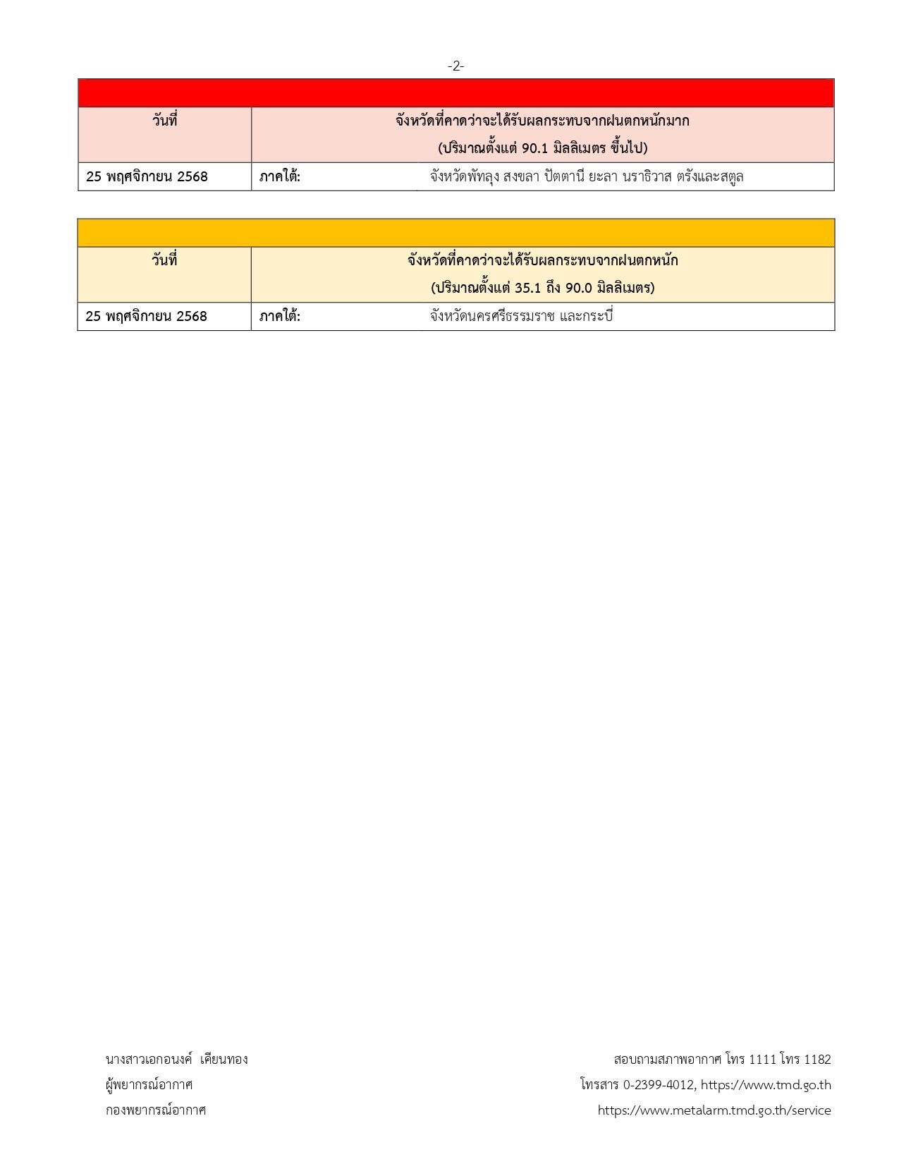 ขอให้ประชาชนติดตามประกาศจากกรมอุตุนิยมวิทยา และสามารถติดตามข้อมูลที่เว็บไซต์กรมอุตุนิยมวิทยา http://www.tmd.go.th หรือที่ 0-2399-4012-13 และ 1182 ได้ตลอด 24 ชั่วโมง ประกาศ ณ วันที่ 25 พฤศจิกายน พ.ศ. 2568 เวลา 17.00 น. กรมอุตุนิยมวิทยาจะออกประกาศฉบับต่อไปในวันที่ 26พฤศจิกายน พ.ศ. 2568 เวลา 05.00 น.