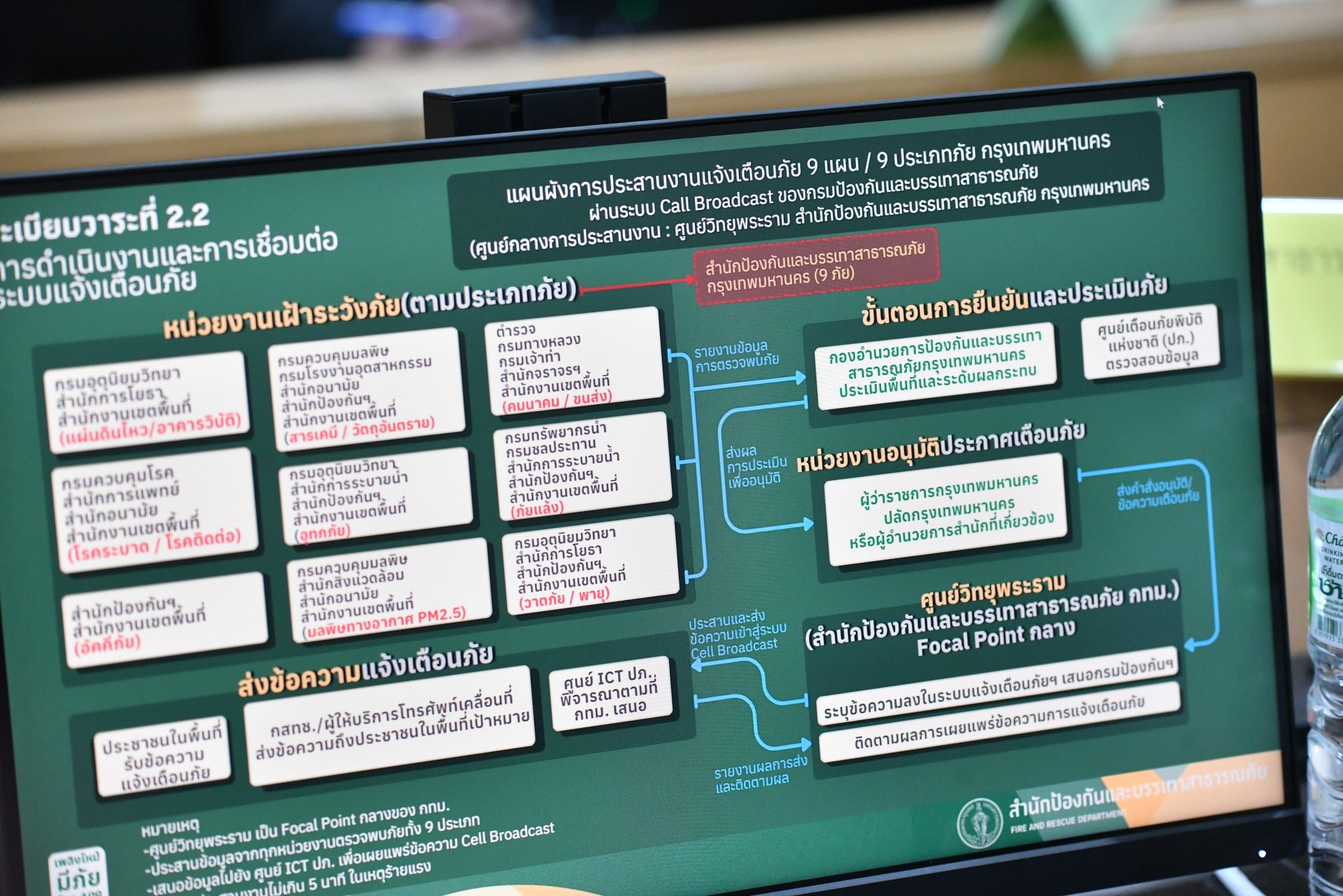ที่ประชุมยังได้หารือถึงแผนผังการประสานงานแจ้งเตือนภัยสำหรับ 9 แผน 9 ประเภทภัยหลักของกรุงเทพมหานคร ประกอบด้วย ภัยจากการคมนาคมและขนส่ง ภัยจากอัคคีภัย ภัยจากสารเคมีและวัตถุอันตราย ภัยจากแผ่นดินไหวและอาคารวิบัติเชิงโครงสร้าง ภัยจากอุทกภัย ภัยจากภัยแล้ง ภัยจากภัยมลพิษทางอากาศประเภทฝุ่น PM2.5 ภัยจากภัยโรคระบาดและโรคติดต่อ ภัยจากภัยวาตภัย