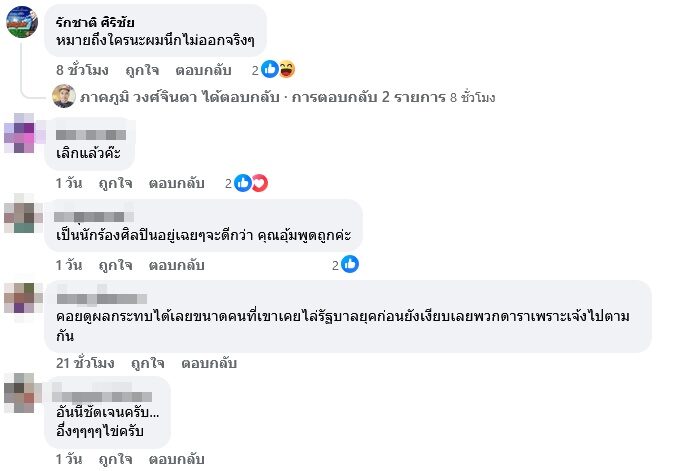 งานนี้มีคอมเมนต์บ้างก็รู้หมายถึงใคร ขณะที่คนในวงการ อาทิ รักชาติ ศิริชัย ก็เข้ามาถามว่า “หมายถึงใครนะผมนึกไม่ออกจริงๆ” รวมทั้งยังมีคอมเมนต์วิจารณ์ต่างๆ นานา หลากหลายมุมมอง