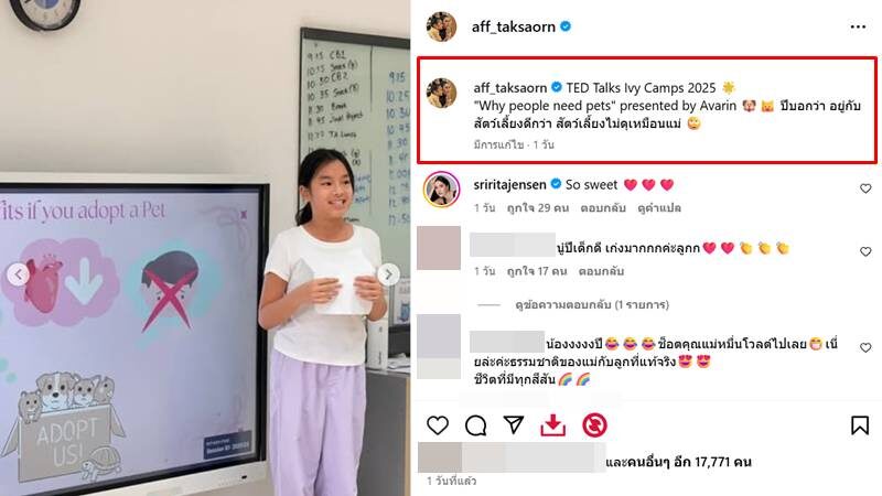 ล่าสุด แม่แอฟ ได้ออกมาโพสต์เล่าเรื่องราวหลังพา น้องปีใหม่ ลูกสาวไปเข้าร่วมแคมป์ TED Talks Ivy Camps 2025 โดยระบุว่า “TED Talks Ivy Camps 2025 “Why people need pets” presented by Avarin ปีบอกว่า อยู่กับสัตว์เลี้ยงดีกว่า สัตว์เลี้ยงไม่ดุเหมือนแม่ ”