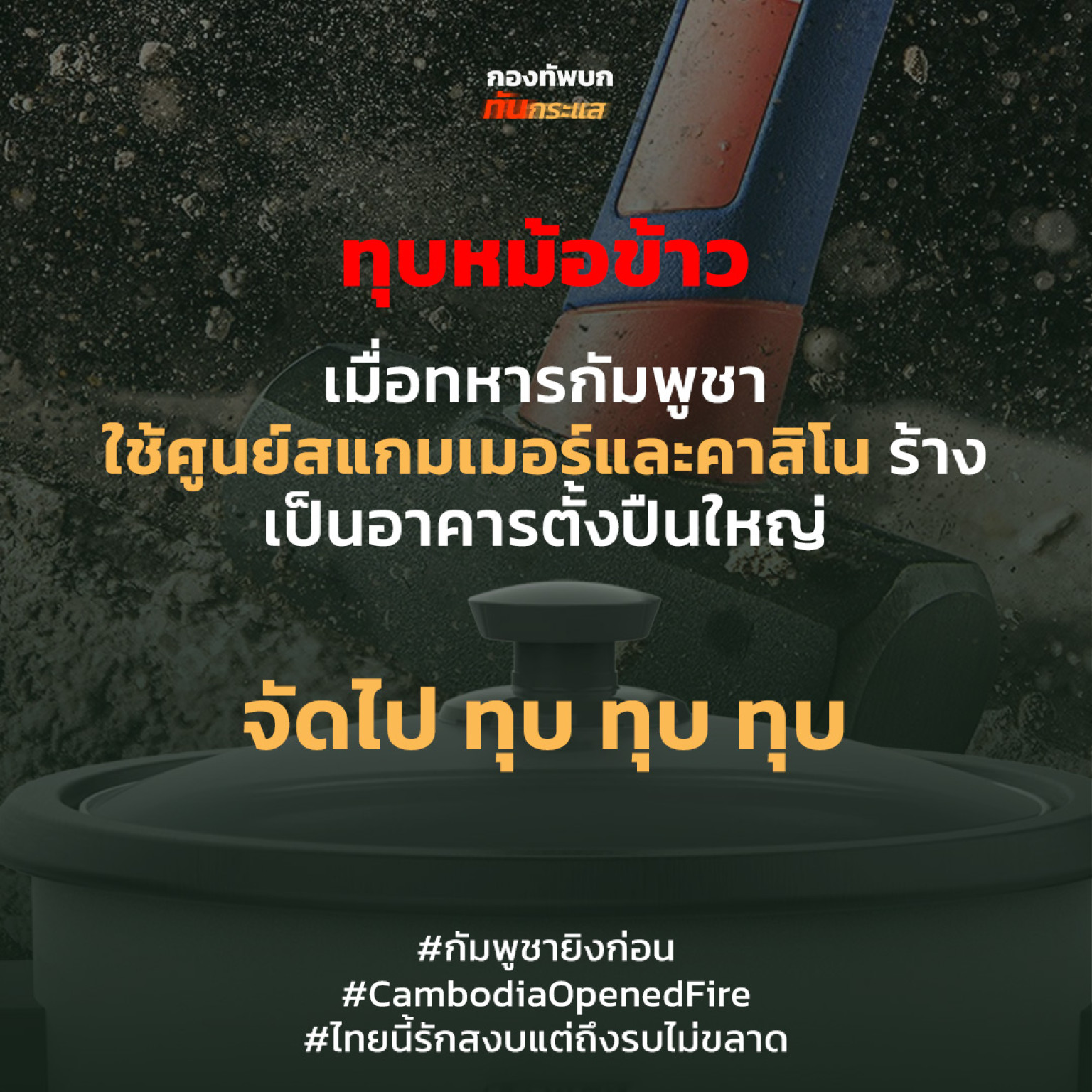 วันที่ 27 ก.ค.68 เพจ กองทัพบก ทันกระแส โพสต์ข้อความระบุว่า ทุบหม้อข้าว! .. เมื่อทหารกัมพูชา ใช้ศูนย์สแกมเมอร์และคาสิโนร้าง เป็นอาคารตั้งปืนใหญ่ … จั...