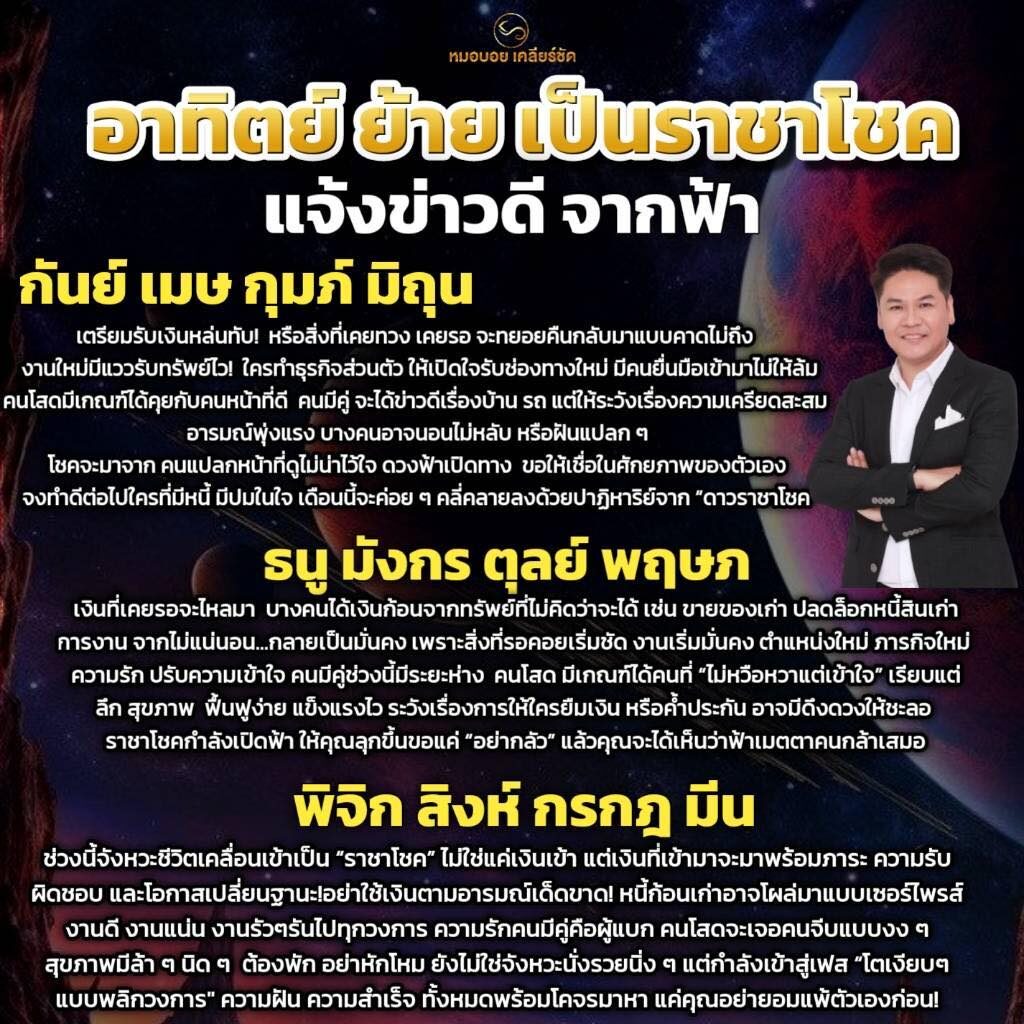 อ่านข่าวต้นฉบับได้ที่ : เปิดดวงราศี อาทิตย์ย้ายเป็นราชาโชค แจ้งข่าวดีจากฟ้า เตรียมรับเงินหล่นทับ