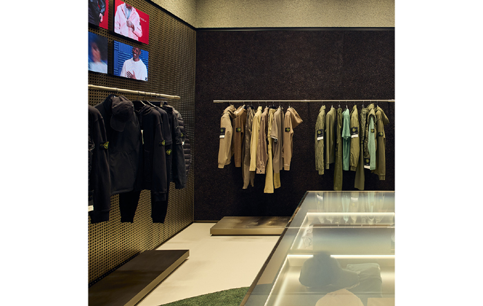 STONE ISLAND สโตร์แห่งใหม่ดีไซน์ผ่านคอนเซ็ปต์ของแบรนด์ “ควานทนทาน และแข็งแกร่ง” ซึ่งพัฒนาร่วมกับสตูดิโอ OMA/AMO ผู้คร่ำหวอดในวงการออกแบบ โดยได้ออกแบบสะท้อนวิถีของแบรนด์ ในส่วนของผนังไม้คอร์ก สีเข้มผ่านเทคนิคการเผาและเป่าด้วยทราย ตลอดจนการเคลือบผิวซึ่งทำให้ผนังของสโตร์แห่งนี้ทั้งเก็บเสียง และสามารถดูดความชื้นได้เป็นอย่างดี ในส่วนของผนังโลหะอีกด้านเจาะรูแทรกด้วยจอดิจิตอลแสดงถึงดีไซน์อันล้ำสมัย เพดานทำด้วยวัสดุอะคูสติกธรรมชาติตกแต่งด้วยแสง ซึ่งออกแบบโดย TIM HOOIJMAN แห่ง DE STUDIO ส่วนผนังอีกด้านมีหุ่นลองเสื้อรูปแบบดิจิทัล และโต๊ะสแตนเลสท็อปกระจกใสตั้งอยู่จุดศูนย์กลางของสโตร์